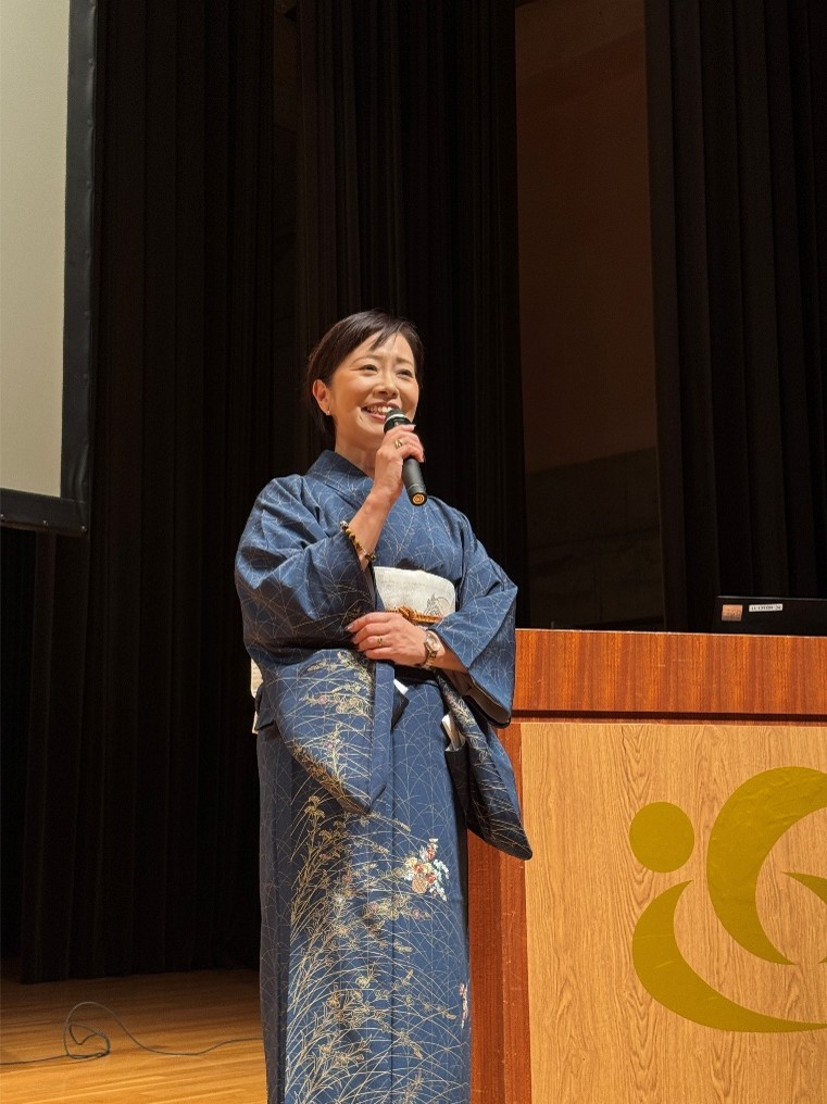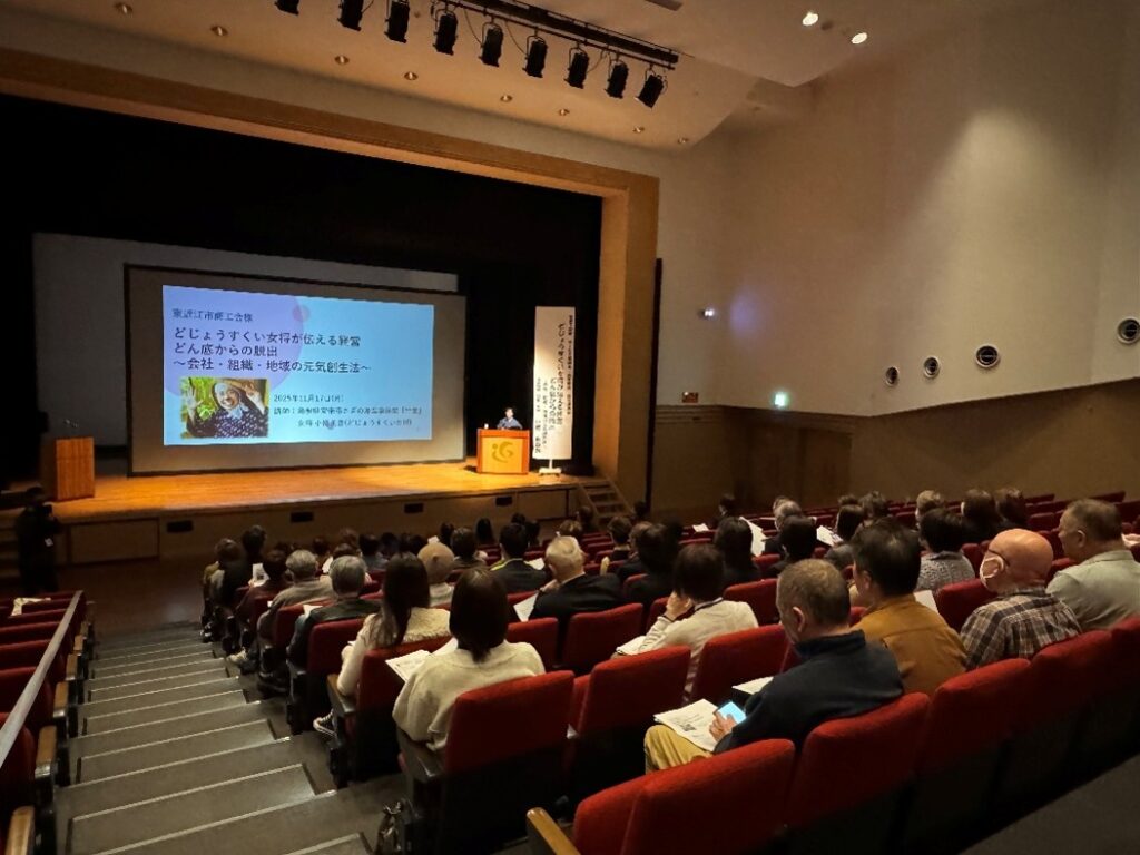 令和7年11月17日(月)に能登川コミュニティセンターにて、両部会より74名の部会員が参加し、合同講演会を開催しました。講師には島根県の温泉旅館「竹葉」の名物女将、小幡美香さんを招聘し、「どじょうすくい女将が伝える経営 どん底からの脱出 ~会社・組織・地域の元気創生法~」と題して講演をしていただきました。
